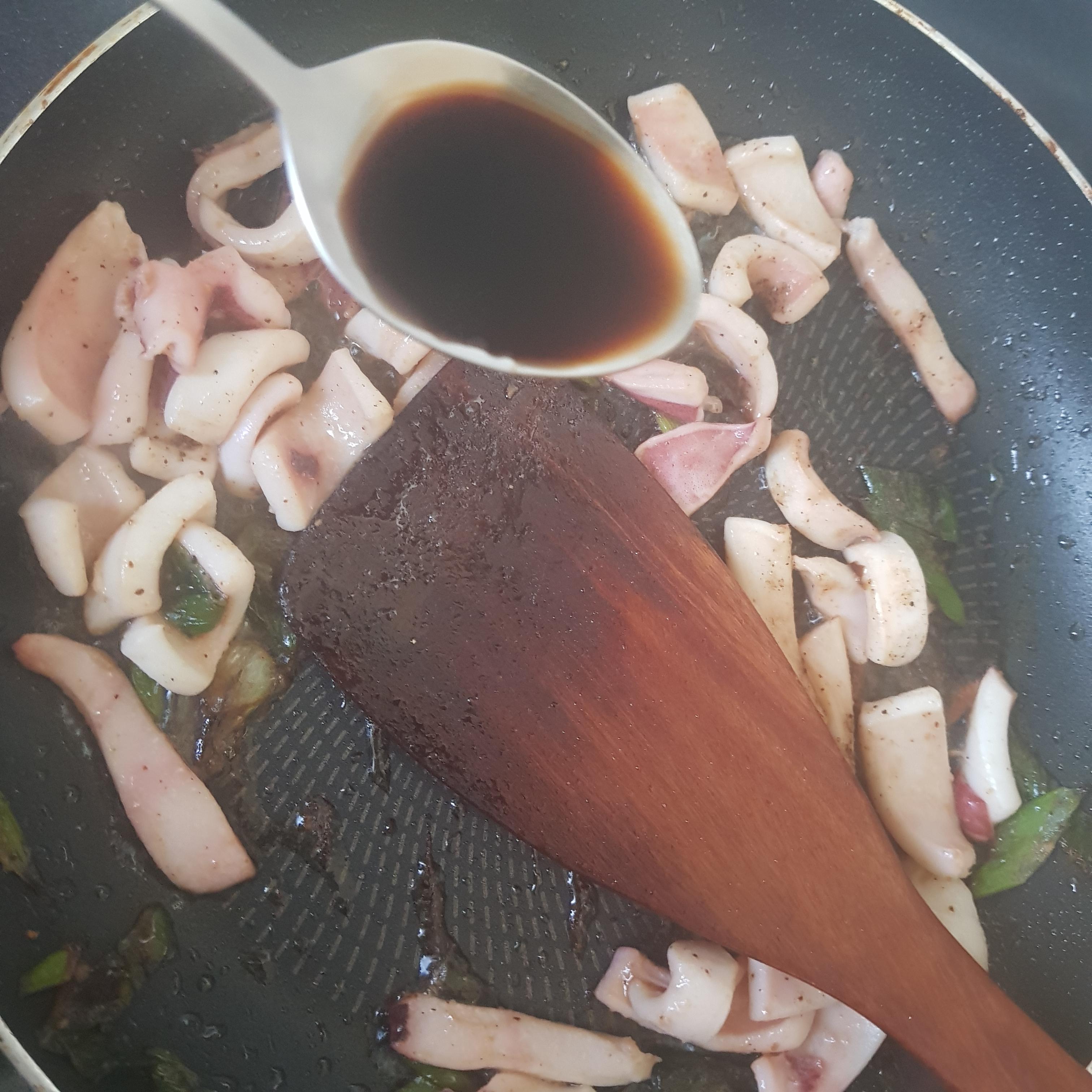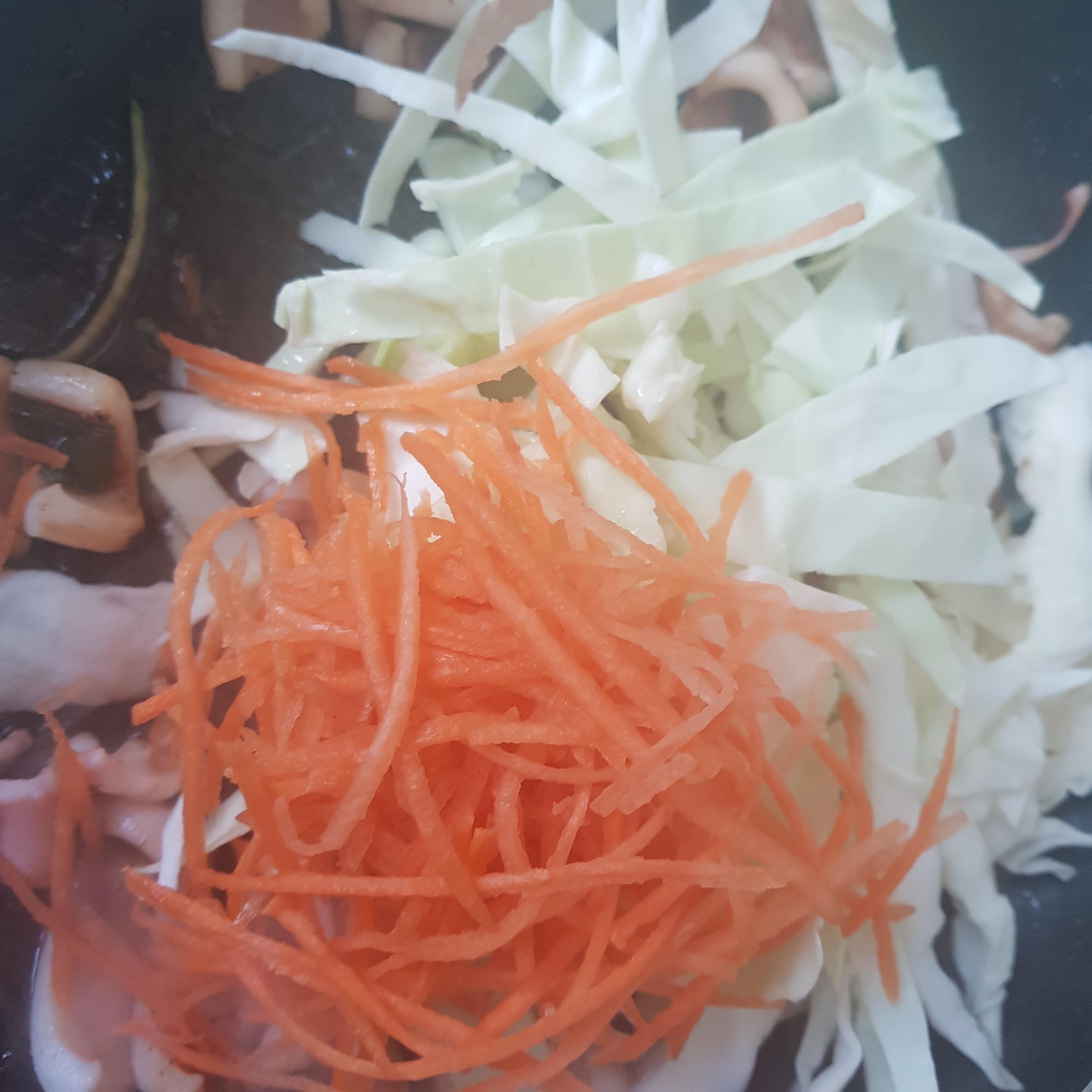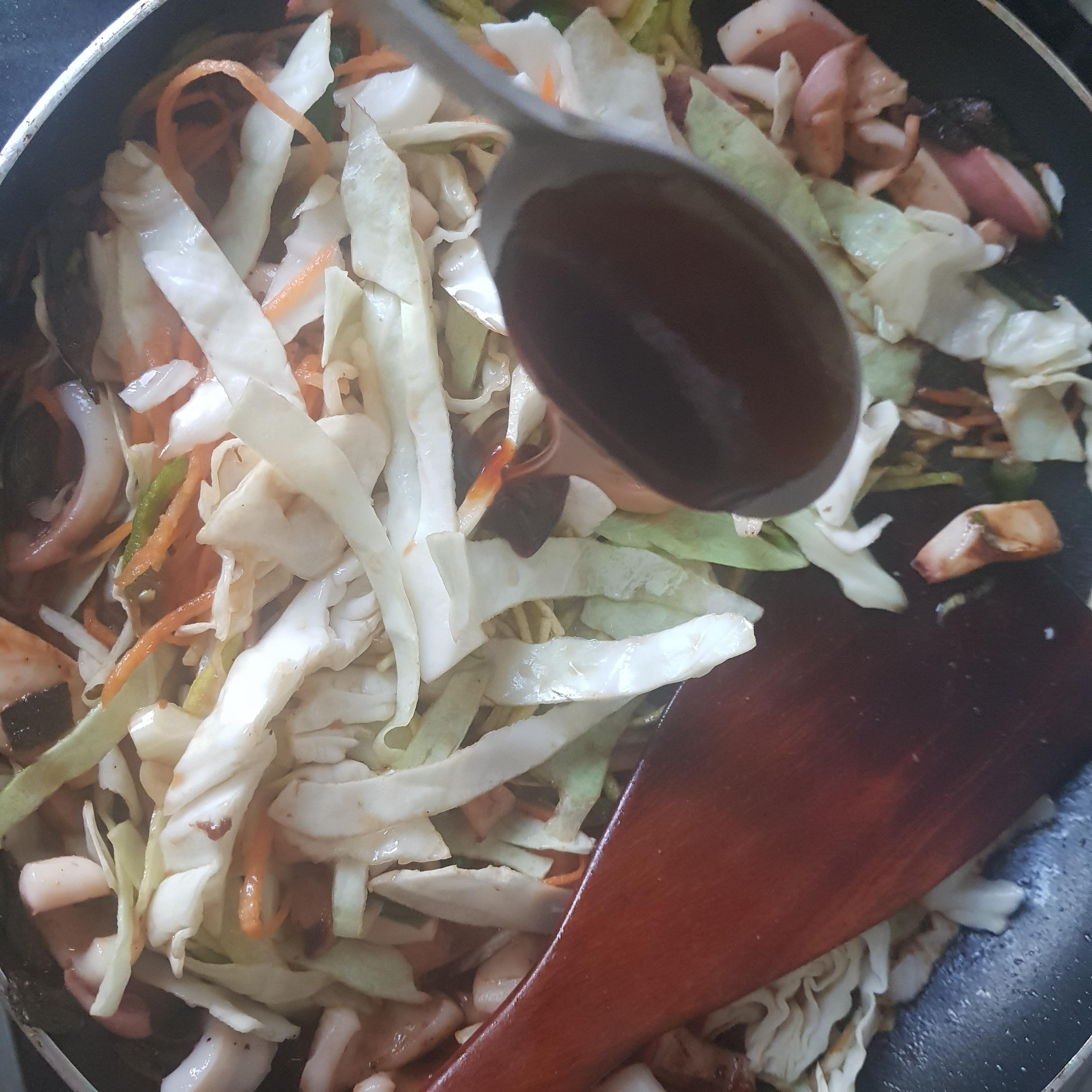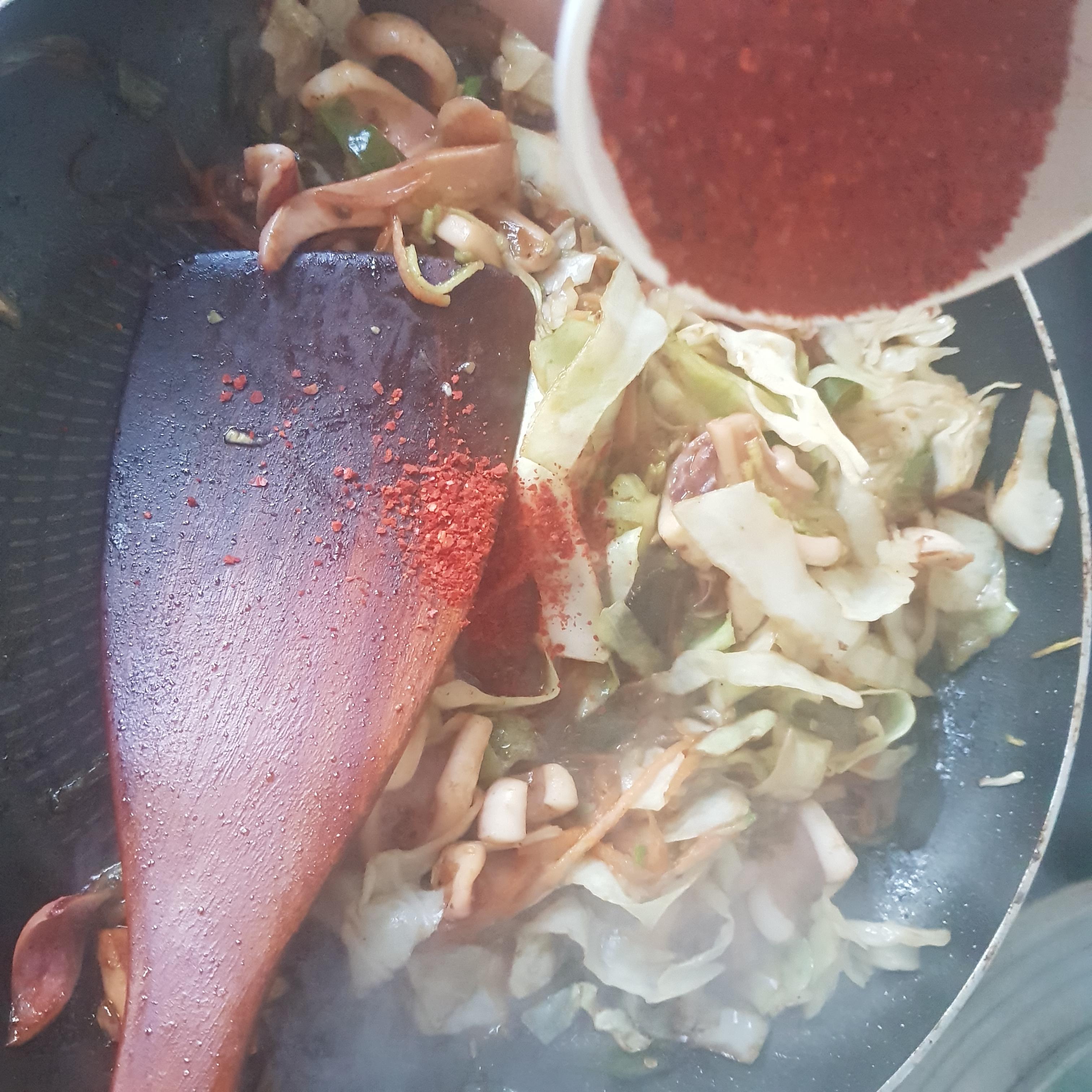 불맛을 내줬으면 이제 양념을 넣어 줍니다 간장 3스푼을 넣고 (간장양이 적혀있지 않아서 임의대로 넣었으며, 간을 보시면서 넣어주시면 될 것 같습니다) 채를 썰어 준비한 양배추, 당근, 호박, 양파, 고추를 넣어줍니다 (전 양파를 깜빡 잊고 넣지 않아서 완전 직전에 넣었습니다 꼭 잊지 말고 준비한 야채를 모두 넣었는지 체크해 줍니다) 그리고 레시피에는 후추를 마지막에 넣어주게 되어있습니다만 전 오징어를 볶을 때 같이 넣고 볶아 주었습니다) 레시피에 나와있지 않았던 굴소스도 한 스푼 넣어주었습니다 마지막으로 고춧가루도 넣어 줍니다 (레시피대로 1컵을 넣었으나, 제 입맛에는 너무 매운 경향이 있었으니 감안하여 입맛에 맞게 조절해 줍니다)