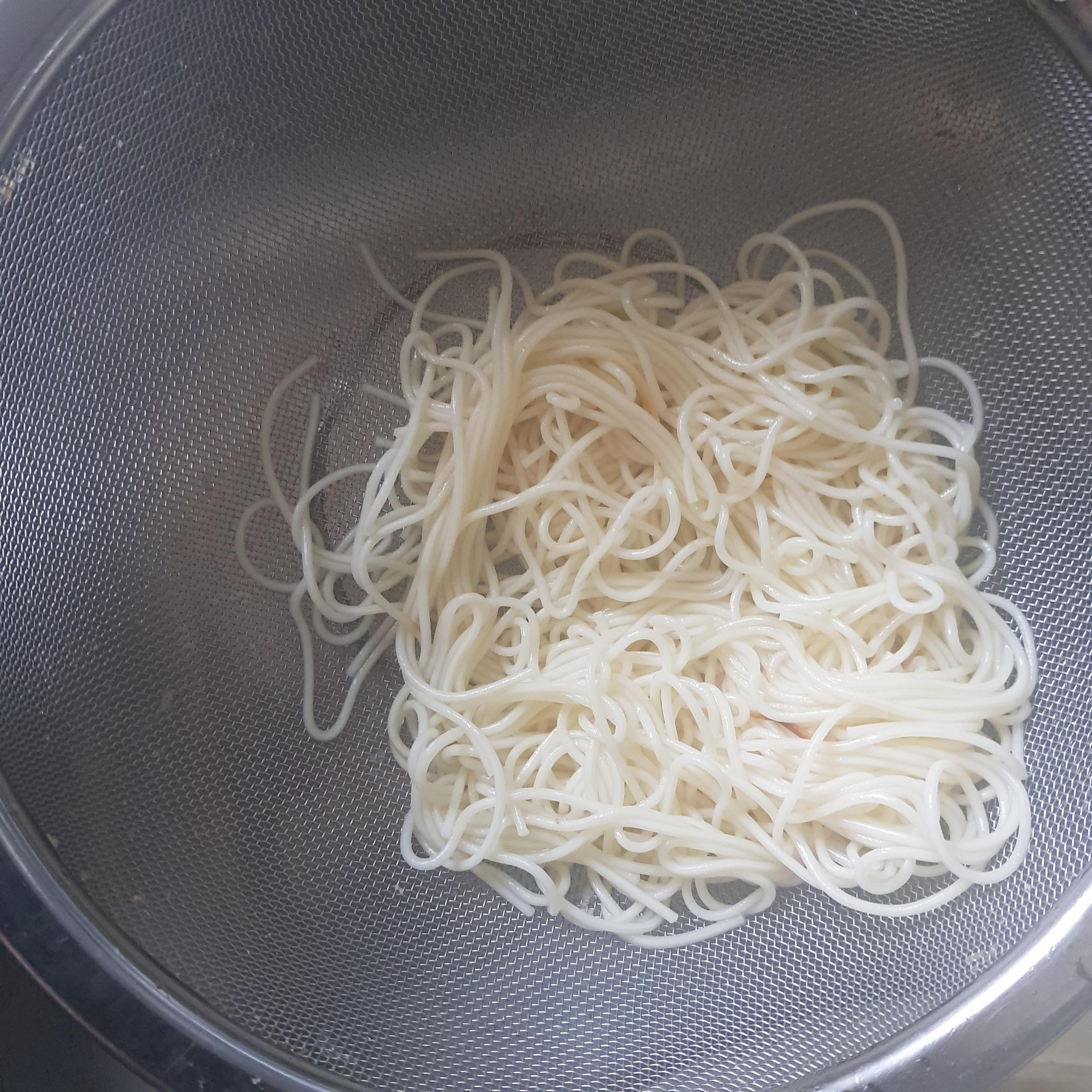 끓는 물에 소금을 넣고 중면을 7~8분 정도 삶아 줍니다 면이 적당히 익었으면 찬물에 헹궈 줍니다