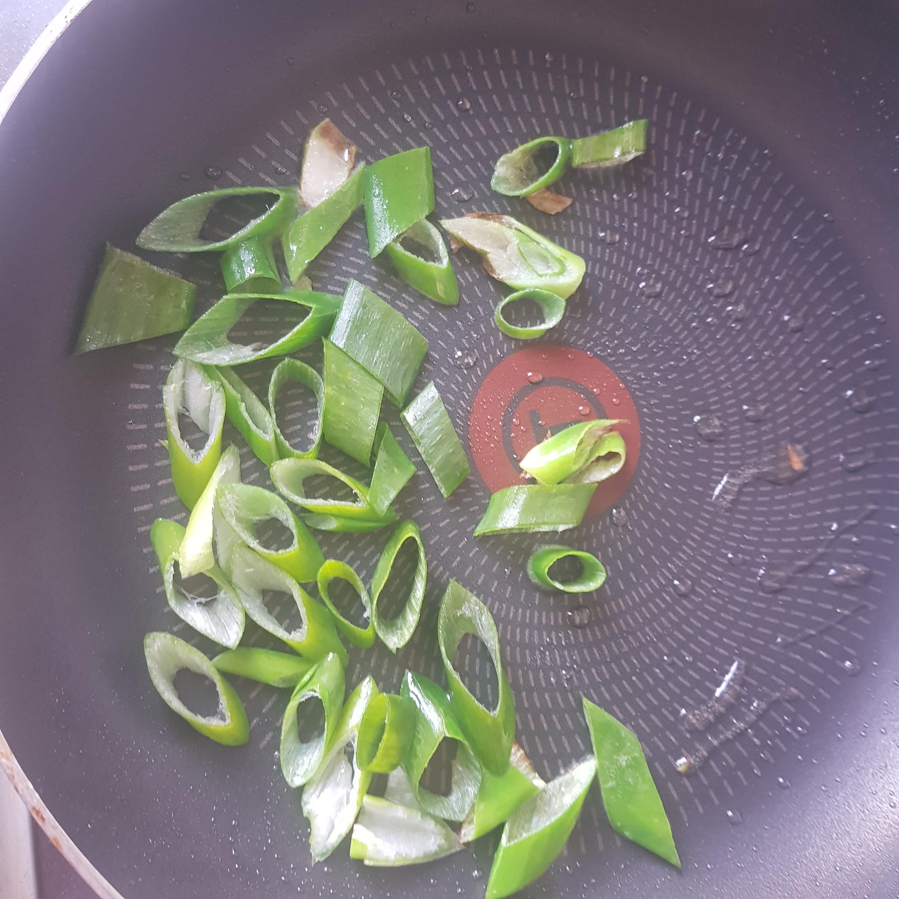 스팸 작은 한통을 지퍼백에 담아 손으로 눌러 으깨 주시면 빠르고 편리하게 준비하실 수 있습니다 (전 다지기로 갈았습니다) 후라이 팬에 기름을 두른 뒤 파를 넣고 파향이 올라올 때까지 볶아 줍니다