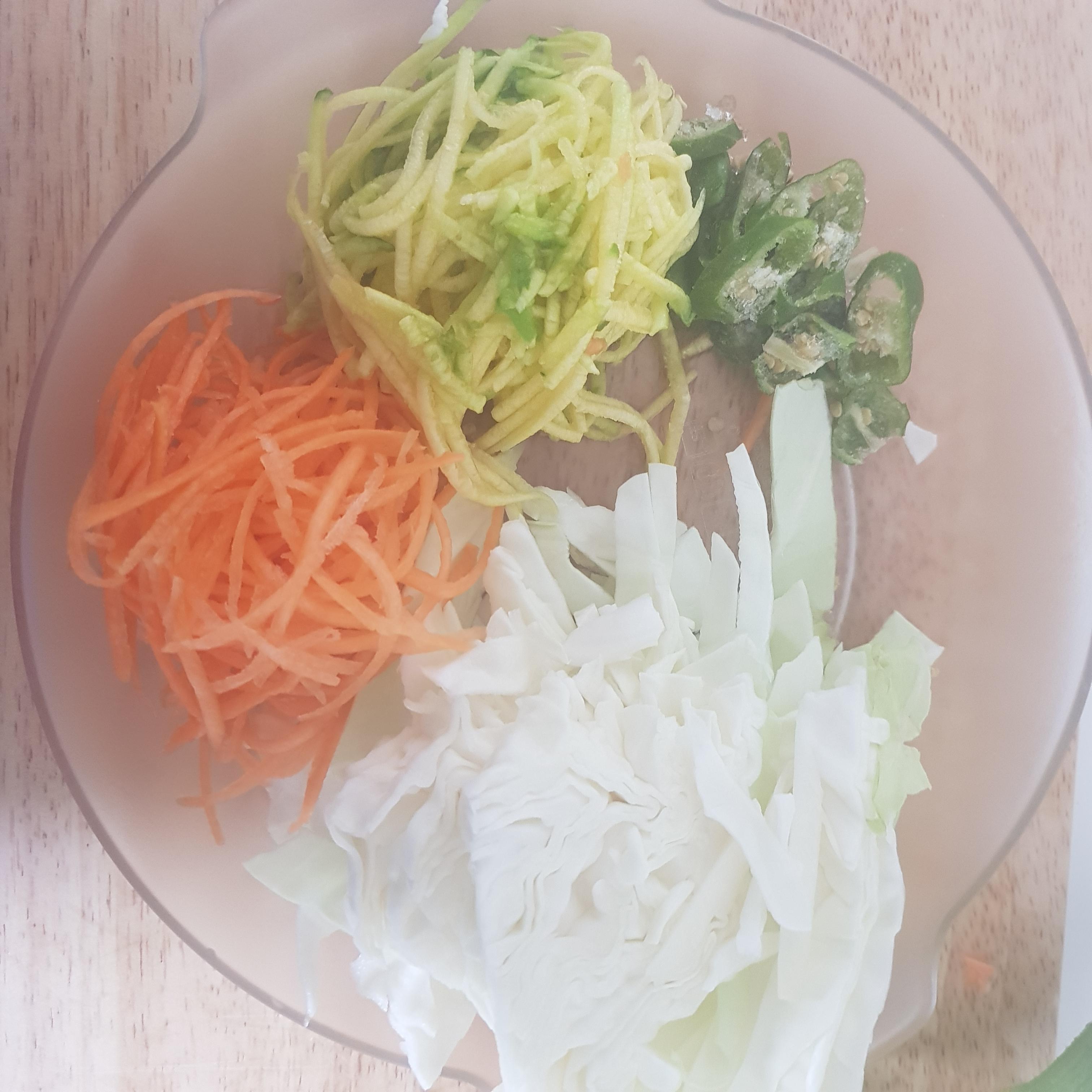 양배추 1종이 컵, 당근 1 종이컵, 호박 1그릇, 양파 1그릇, 고추 1 작은 종이컵, 부추 (전 생략), 파, 생강 (전 생강가루로 대체), 고춧가루, 간장, 소금