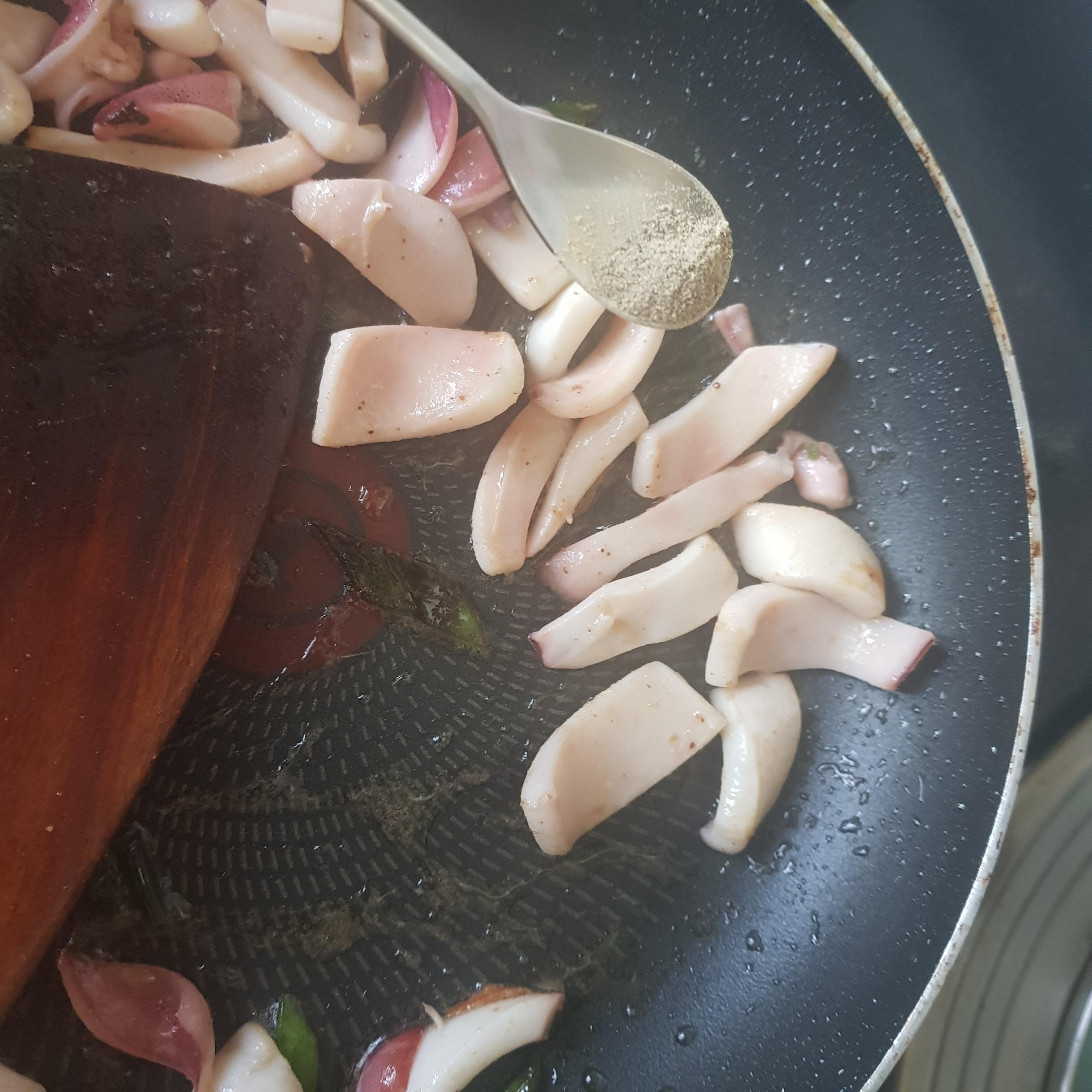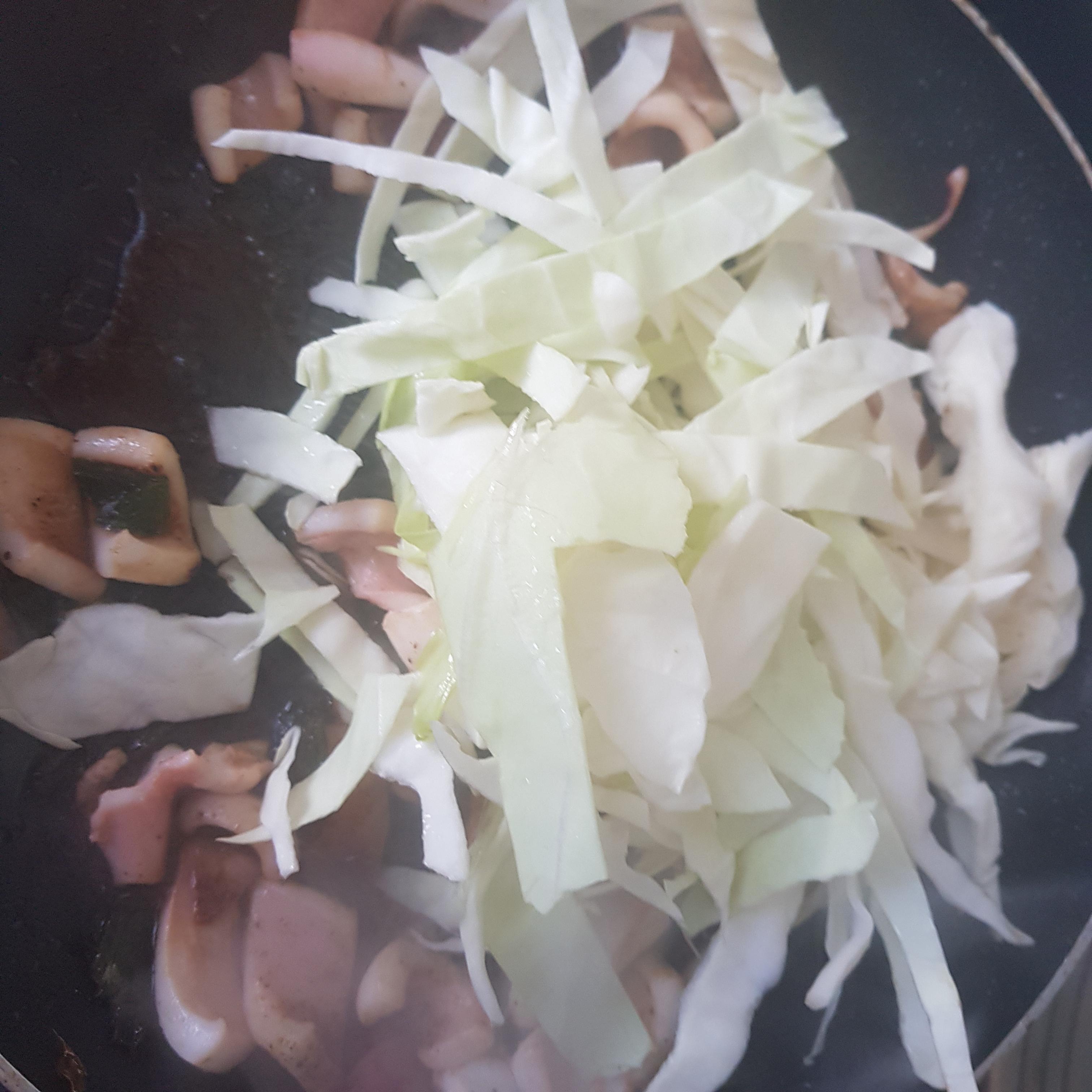 돼지 고기를 볶다가 오징어를 함께 넣고 볶아 줍니다(전 돼지고기를 생략했기 때문에 오징어만 넣고 볶아 주었습니다) 불맛을 내기 위해선 센 불을 이용하여 국물이 달궈진 팬에 눌어붙는 것이 중요합니다