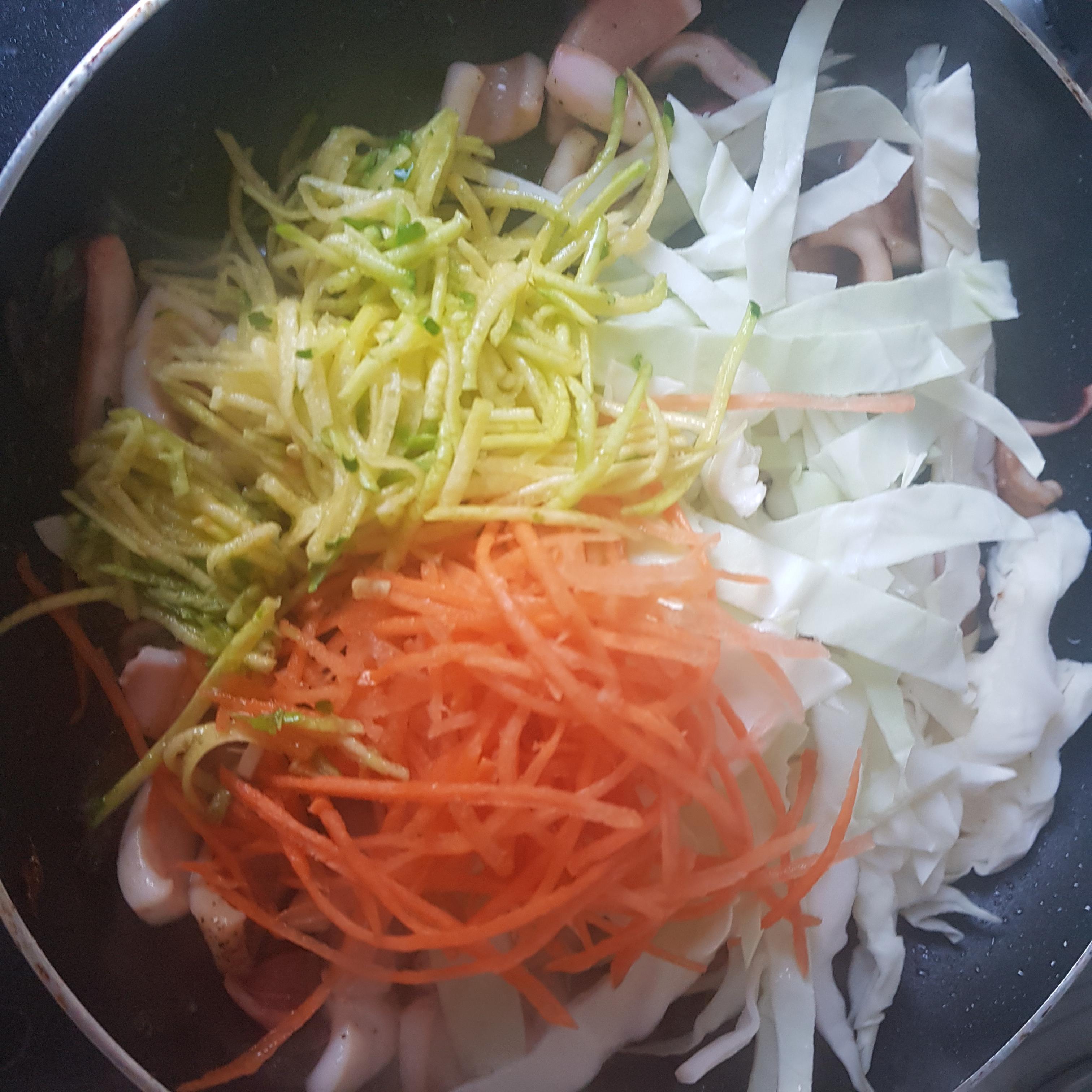 오징어 껍질을 소금으로 문질러 제거해 줍니다(전 미리 손질되어 있던 오징어를 꺼내서 사용 하였습니다) 그리고 적당한 크기로 잘라 줍니다 양파, 애호박, 양배추, 호박을 채썰기 하여 준비해줍니다 (전 부추를 넣지 않았지만 부추를 넣으실 분은 적당한 크기로 잘라 주시면 됩니다 고추는 어슷썰기 하여 준비해 줍니다