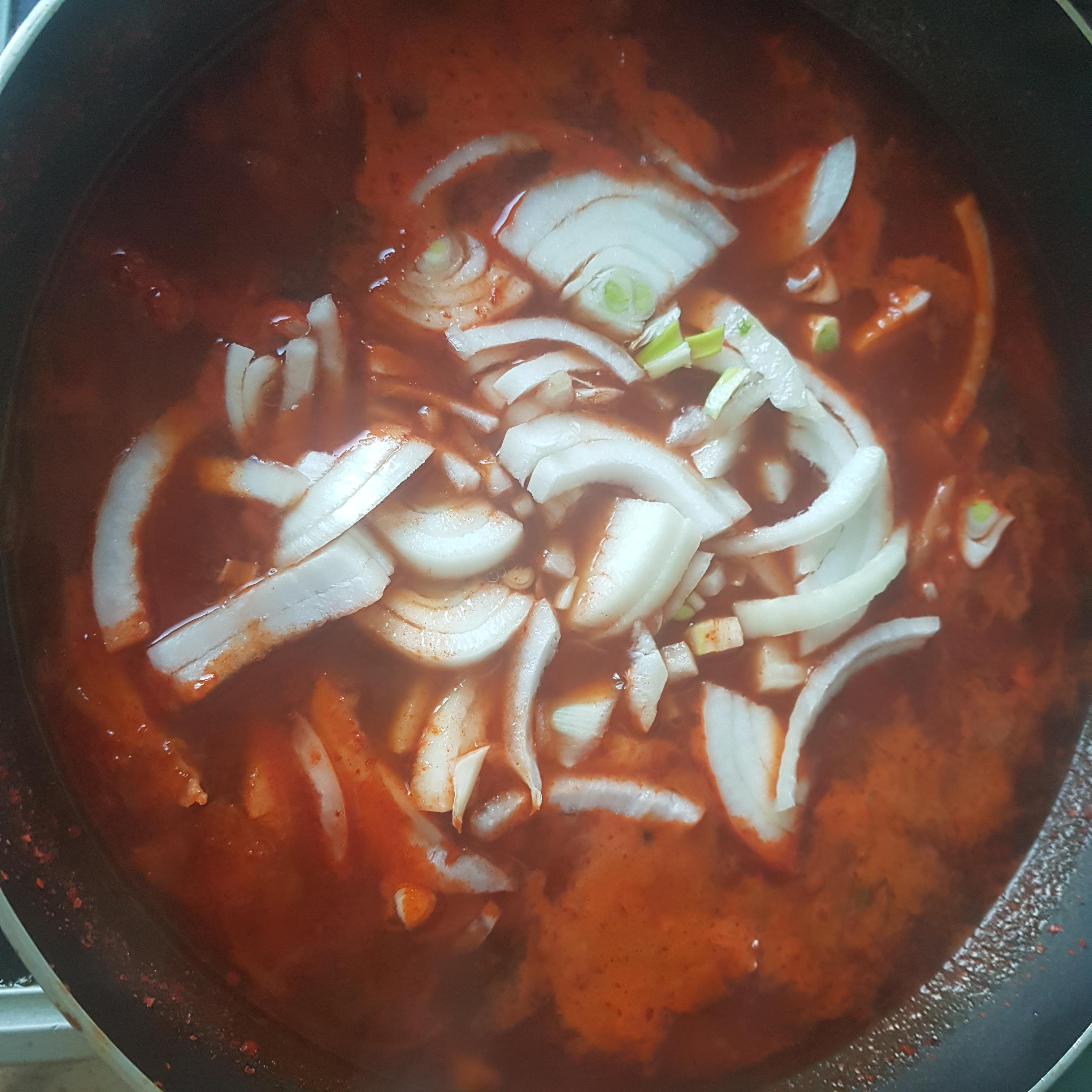 양에 맞게 물을 넣으라고 레시피에 나와있어 전 8컵을 넣었습니다 물을 알맞게 넣었으면 준비된 홍합이나 다른 해산물을 넣어 줍니다 소금으로 간을 해주시고 후추를 넣어 줍니다(전 오징어와 야채를 볶을 때 이미 넣어서 이과정에서는 후추를 넣지 않았습니다 야채를 볶을때 잊어버렸던 양파를 이때 넣어줬습니다) 짬뽕을 밥과 함께 드실 분은 부추를 넣고 드시면 됩니다